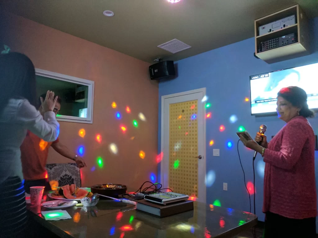 Choose and sing songs thru our song book catalog. There are thousands of songs in different languages incl. English. You can also sing any song thru your Apple Smart device using Bluetooth Audio connectivity for voice and music (audio) only. For video and song lyrics, you will still need to use your smart device to read all song lyrics to sing. Happy Singing!!!